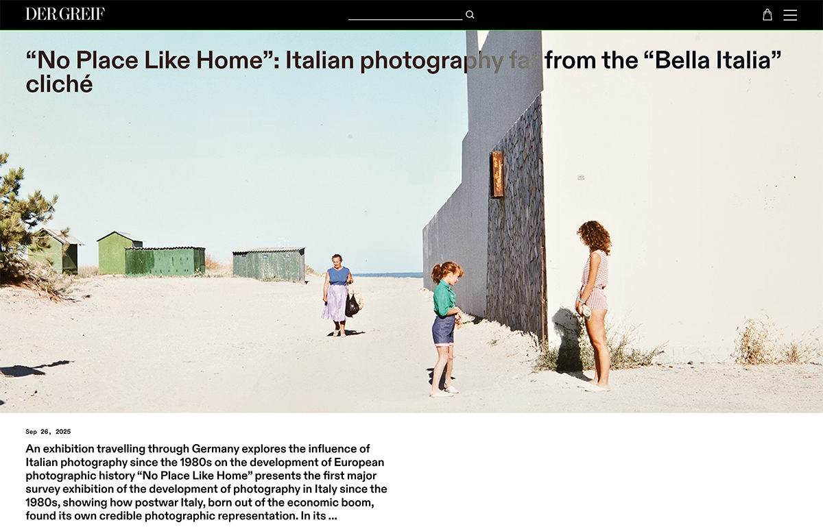 Unter der Überschrift „No Place Like Home“: Italienische Fotografie fernab vom Klischee der „Bella Italia“ berichtet DER GREIF über die Ausstellung und stellt seine besodondere Bedeutung als wegweisende Übersichtsschau zur italienischen Fotografie und Untersuchung der Einflüsse der italienischen Fotografie seit den 1980er Jahren auf die Entwicklung der europäischen Fotografiegeschichte hervor.