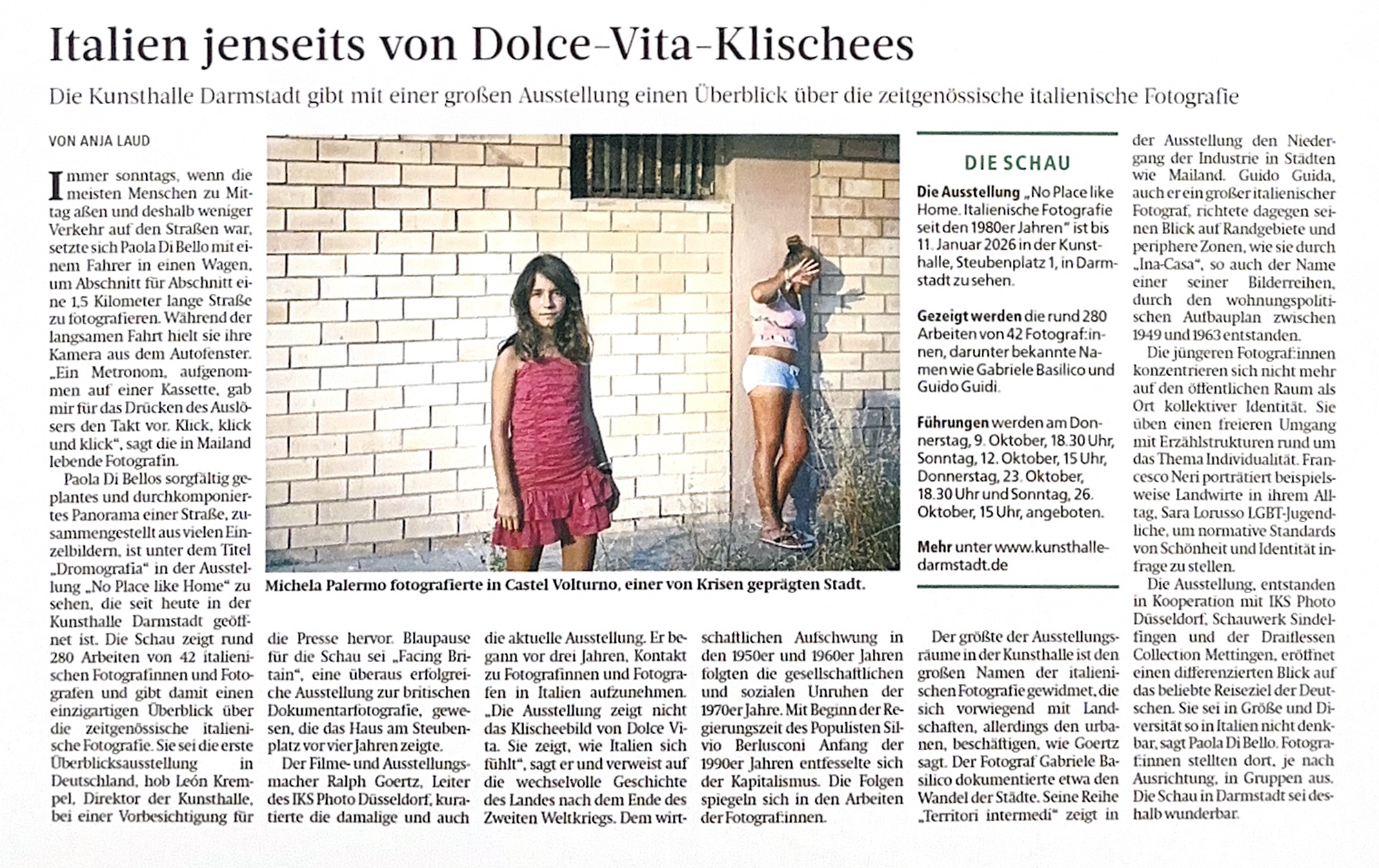 Vielen Dank an Anja Laud, die unsere Ausstellung NO PLACE LIKE HOME besucht hat und sie als einen "einzigartigen Überblick über die zetgenössische italienische Fotografie" hervorhebt. Sie schließt mit den Worten Paola di Bello's: "Die Schau in Darmstadt sei wunderbar".